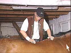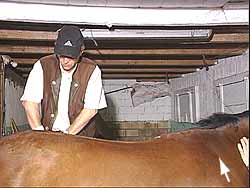Hannes Hunziker streicht dem Pferd mehrmals über den Rücken. Der Schmerzpunkt ist verschwunden, das Pferd "zeichnet" nicht mehr. |