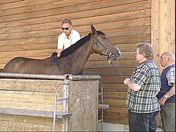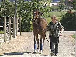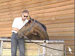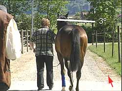 Hannes Hunziker streicht dem Pferd mehrmals über den Rücken. Der Hengst zeigt die schmerzhafte Wirbelblockierung durch ein ausweichendes Absenken der Kruppe. Nach der chiropraktischen Behandlung ist der Erfolg sofort sichtbar: Das Pferdf "zeichnet" nicht mehr.
